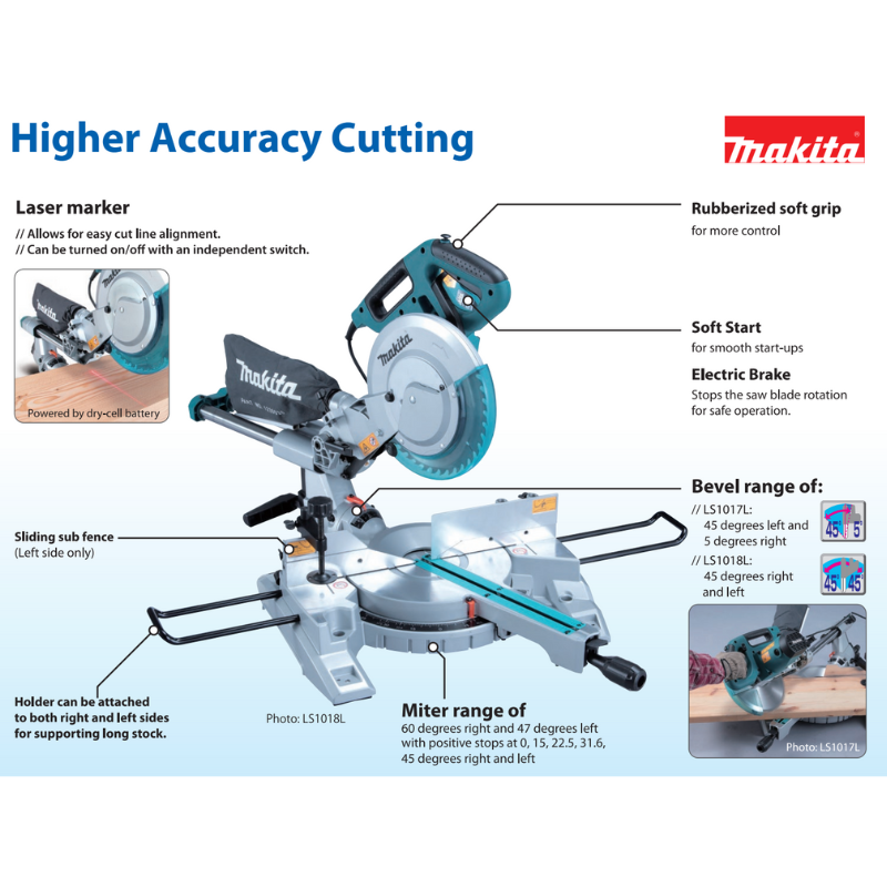 The MAKITA LS1018L delivers precision and control for demanding cutting tasks. Its dual-direction 45-degree bevel capability handles angled cuts in both directions, while the ergonomic rubberized grip ensures comfort during extended use. The integrated electric brake maximizes productivity by stopping the blade quickly, reducing downtime between cuts. An included dust bag maintains a cleaner workspace, protecting both you and your equipment from debris accumulation. Built for professional-grade performance and reliability.
